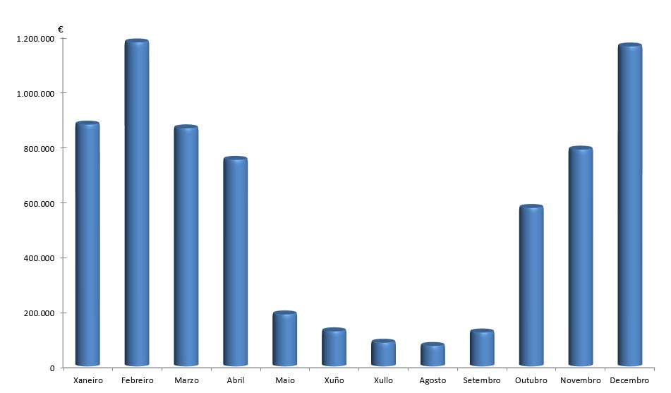 | Xaneiro | Febreiro | Marzo | Abril | Maio | Xuño | Xullo | Agosto | Setembro | Outubro | Novembro | Decembro | Total | |