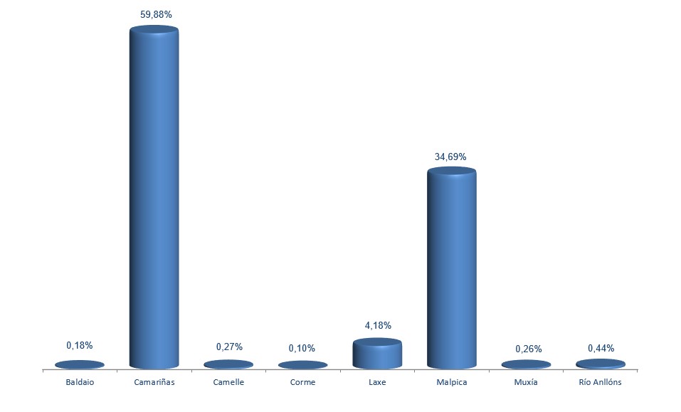 | Río Anllóns | 31.342 | 0,44% | 254.689 | 2,55% | 8,13 |