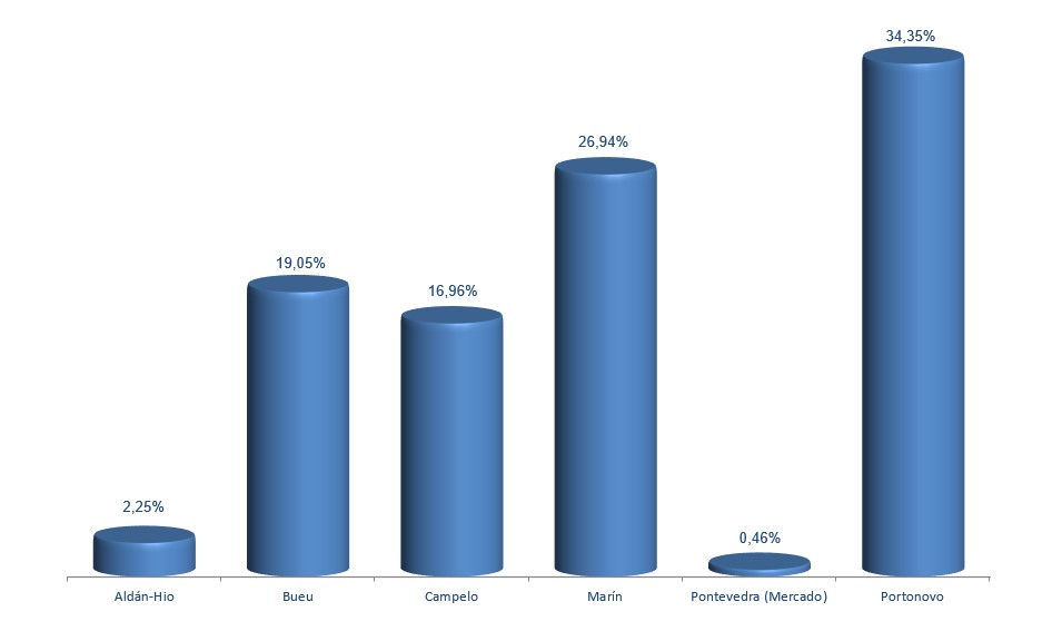 | Pontevedra (Mercado) | 13.069 | 0,46% | 199.596 | 1,68% | 15,27 |