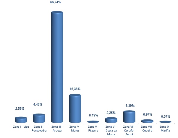| Zona VI - Costa da Morte | 79 | 6.032 | 2,25% | 166.252 | 2,26% | 27,56 |