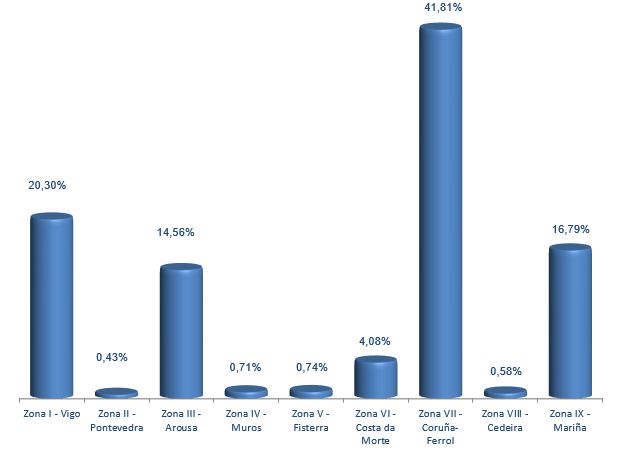 | Zona II - Pontevedra | 274 | 7.051 | 0,43% | 12.226 | 0,45% | 1,73 |