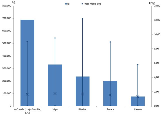 | A Coruña (Lonja Coruña, S.A.) | 253 | 688.200 | 41,79% | 1.145.569 | 42,52% | 1,66 |