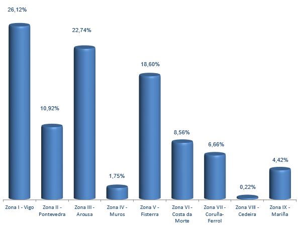 | Zona VI - Costa da Morte | 34 | 52.882 | 8,56% | 481.597 | 8,96% | 9,11 |
