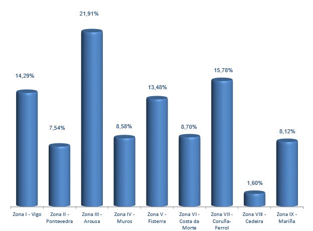 | Zona VI - Costa da Morte | 222 | 88.789 | 8,70% | 663.200 | 8,45% | 7,47 |