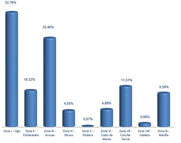 | Zona II - Pontevedra | 130 | 452.658 | 10,32% | 227.428 | 8,53% | 0,50 |
