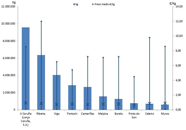 | A Coruña (Lonja Coruña, S.A.) | 257 | 9.592.249 | 30,02% | 8.816.093 | 33,28% | 0,92 |