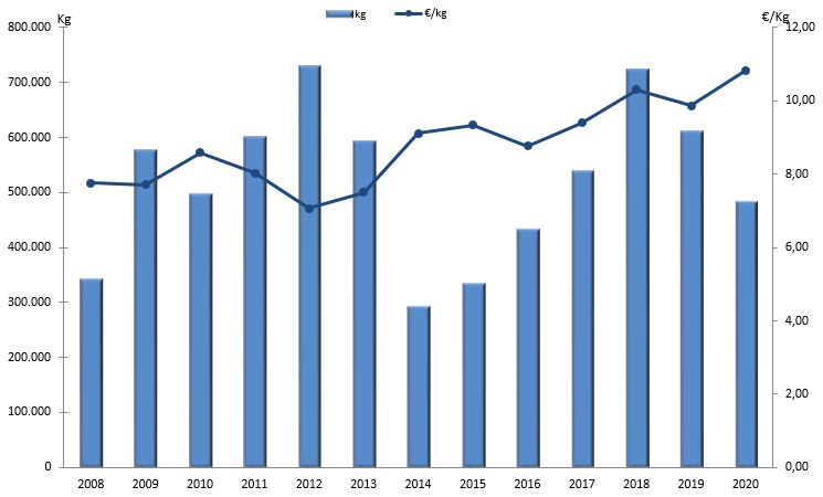 | Centola ou centolo | 44 | 916 | 0,19% | 10.632 | 0,20% | 11,60 |