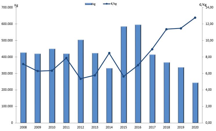 | Centola ou centolo | 137 | 14.093 | 5,78% | 206.082 | 6,62% | 14,62 |