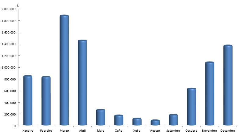 | Xaneiro | Febreiro | Marzo | Abril | Maio | Xuño | Xullo | Agosto | Setembro | Outubro | Novembro | Decembro | Total | |
