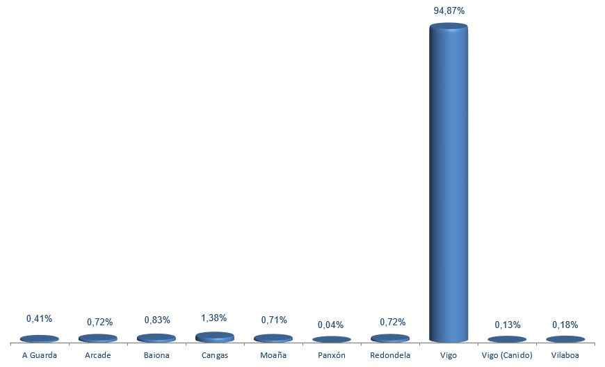 | Cangas | 366.782 | 1,38% | 4.234.649 | 4,16% | 11,55 |