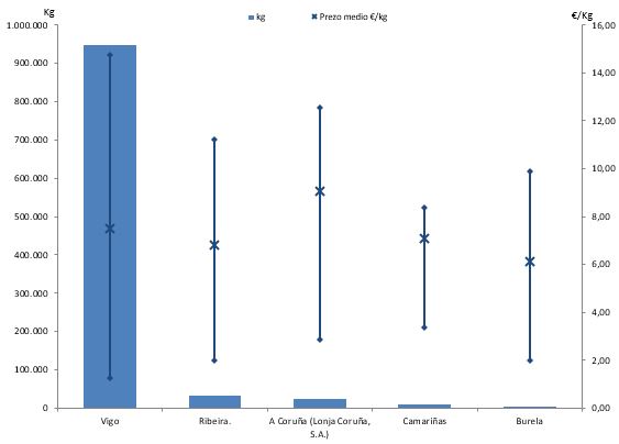 | A Coruña (Lonja Coruña, S.A.) | 109 | 23.055 | 2,27% | 208.803 | 2,74% | 9,06 |
