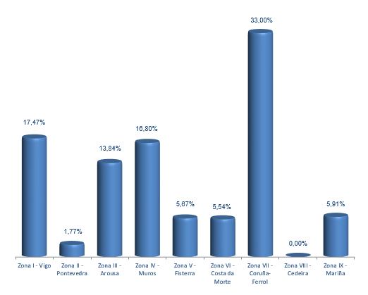 | Zona VI - Costa da Morte | 93 | 499.891 | 5,54% | 567.443 | 5,41% | 1,14 |