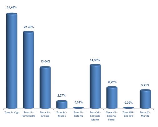 | Zona VI - Costa da Morte | 95 | 148.627 | 14,36% | 87.903 | 12,31% | 0,59 |
