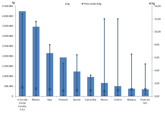 | A Coruña (Lonja Coruña, S.A.) | 261 | 4.240.281 | 25,03% | 5.797.338 | 30,92% | 1,37 |