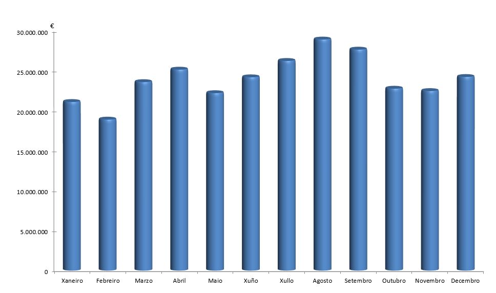| Xaneiro | Febreiro | Marzo | Abril | Maio | Xuño | Xullo | Agosto | Setembro | Outubro | Novembro | Decembro | Total | |