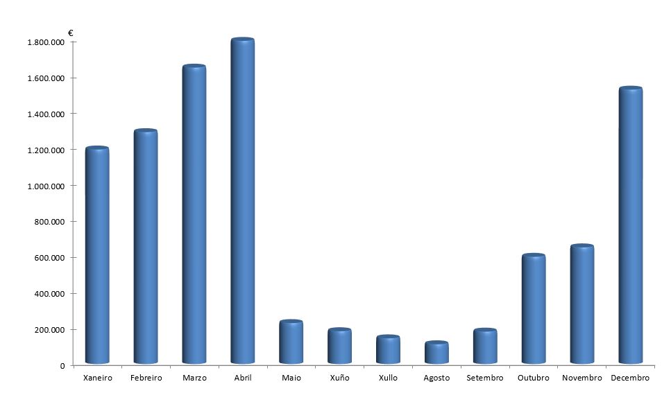 | Xaneiro | Febreiro | Marzo | Abril | Maio | Xuño | Xullo | Agosto | Setembro | Outubro | Novembro | Decembro | Total | |