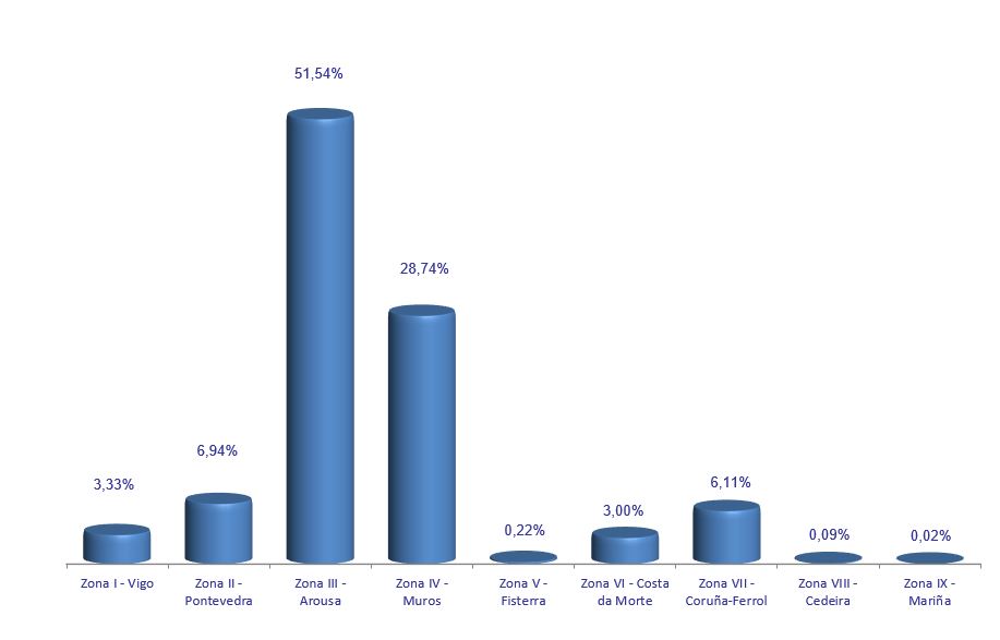| Zona VI - Costa da Morte | 128 | 7.817 | 3,00% | 217.358 | 2,73% | 27,81 |