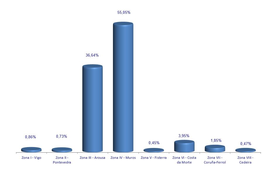 | Zona VI - Costa da Morte | 150 | 90.778 | 3,95% | 649.970 | 4,44% | 7,16 |