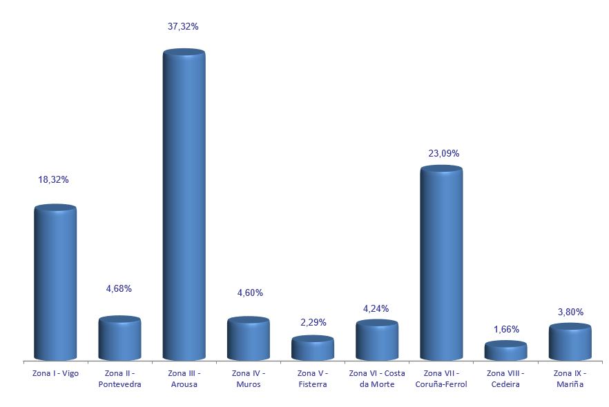 | Zona III - Arousa | 164 | 261.467 | 37,32% | 2.916.408 | 45,21% | 11,15 |