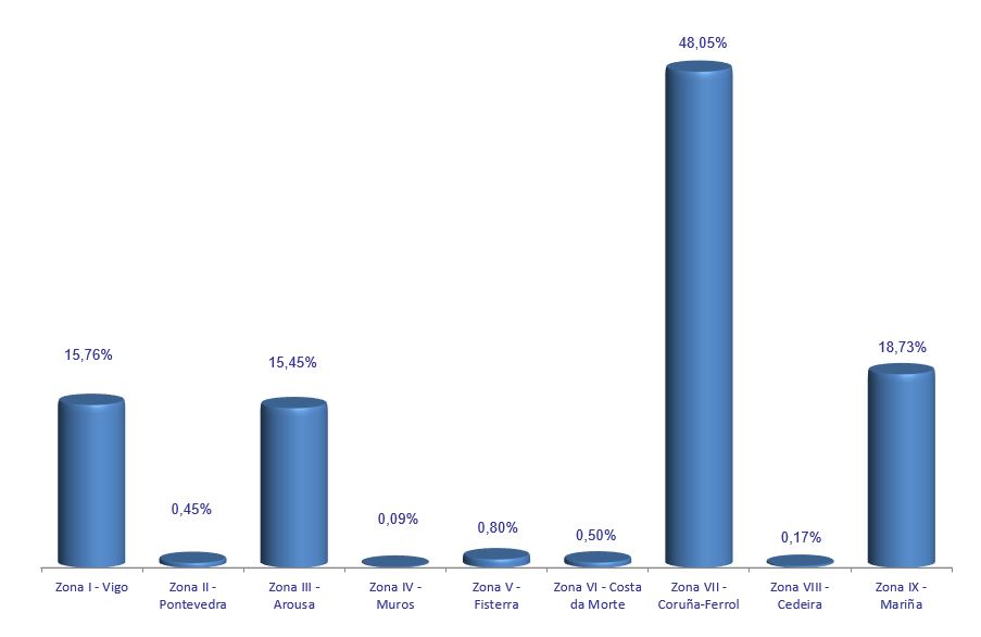 | Zona VI - Costa da Morte | 205 | 6.476 | 0,50% | 7.672 | 0,28% | 1,18 |