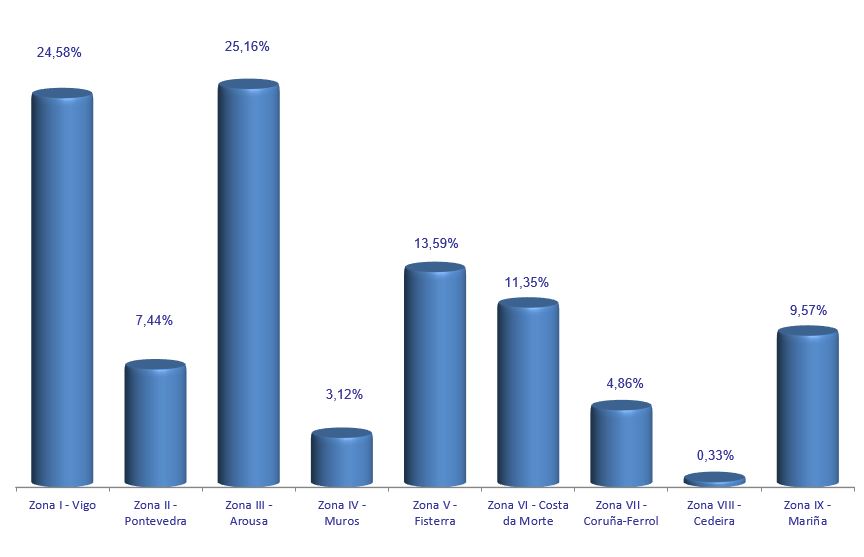 | Zona III - Arousa | 69 | 165.021 | 25,16% | 1.951.766 | 26,09% | 11,83 |