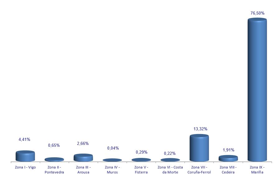| Zona VI - Costa da Morte | 244 | 48.770 | 0,22% | 191.543 | 0,19% | 3,93 |