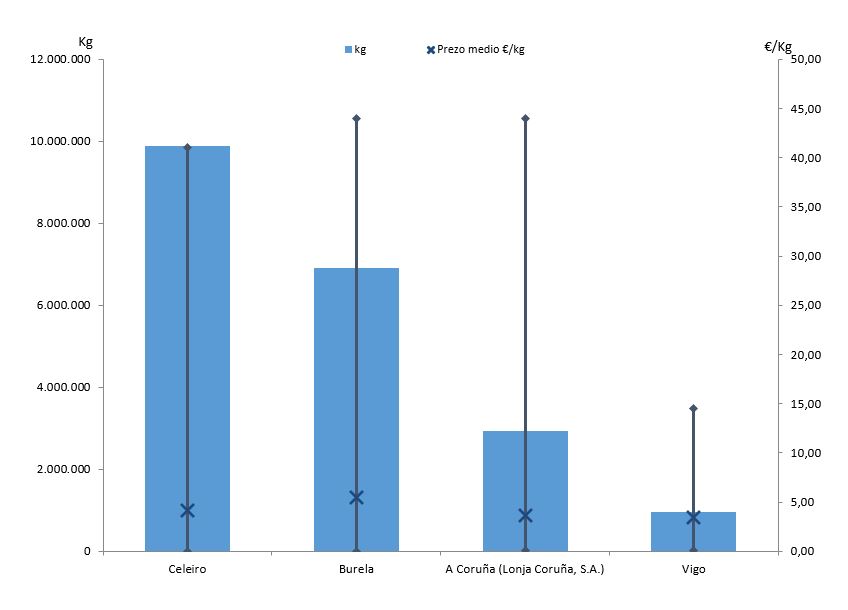 | A Coruña (Lonja Coruña, S.A.) | 294 | 2.925.631 | 13,32% | 10.772.605 | 10,95% | 3,68 |