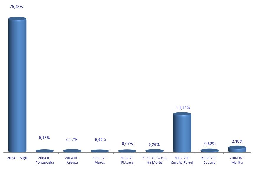 | Zona II - Pontevedra | 84 | 3.682 | 0,13% | 31.747 | 0,19% | 8,62 |