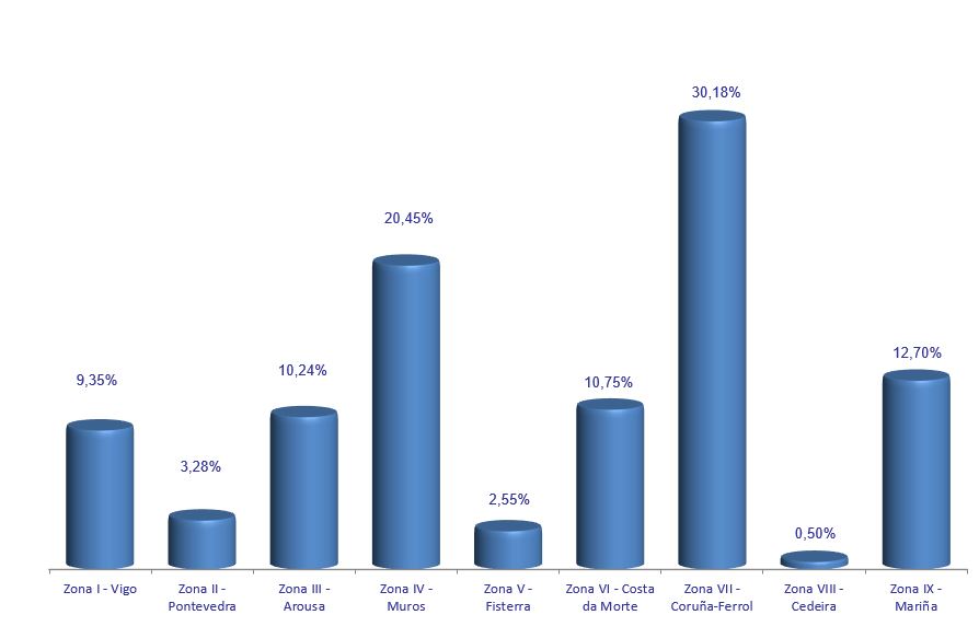 | Zona V - Fisterra | 233 | 404.096 | 2,55% | 384.433 | 2,18% | 0,95 |