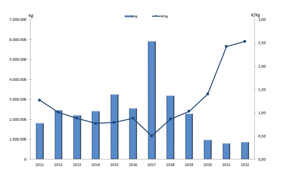 | Centola ou centolo | 148 | 9.063 | 1,05% | 88.078 | 4,02% | 9,72 |