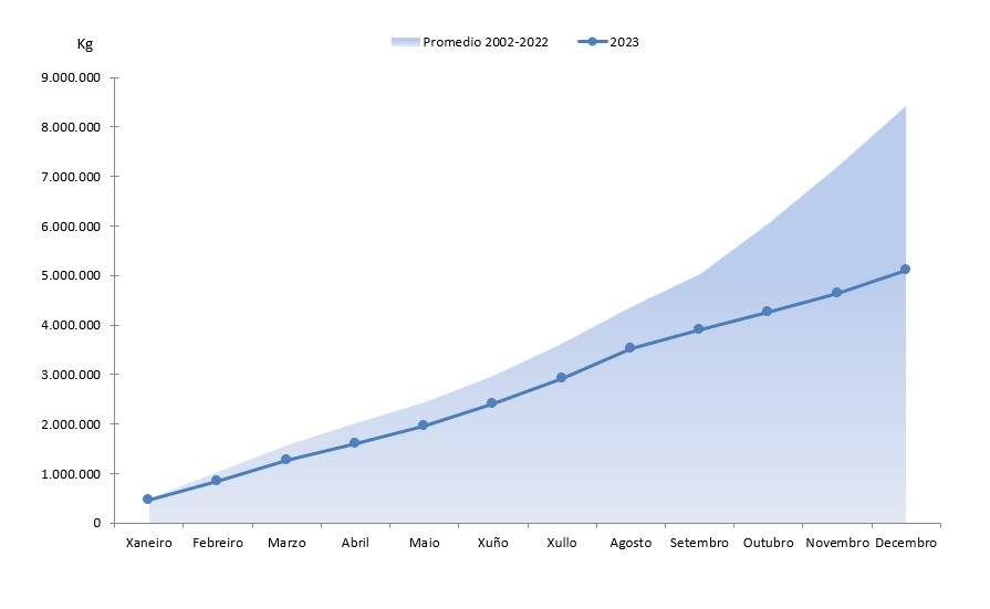 | Zamburiña | 24.640 | 324.791 | 30.122 | 313.912 | -5.482 | 10.880 | -18,20% | 3,47% |