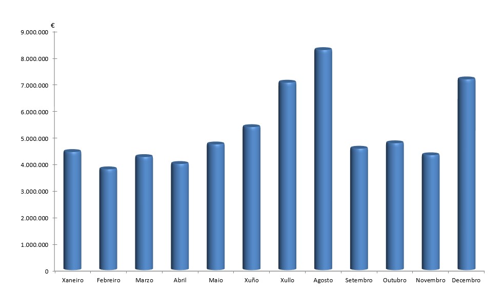 | Xaneiro | Febreiro | Marzo | Abril | Maio | Xuño | Xullo | Agosto | Setembro | Outubro | Novembro | Decembro | Total | |
