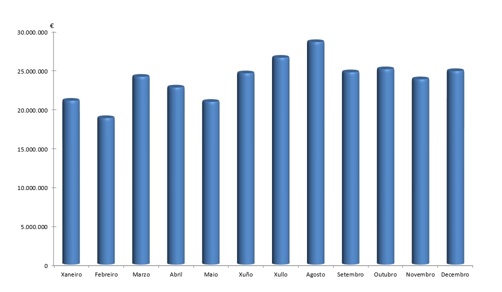 | Xaneiro | Febreiro | Marzo | Abril | Maio | Xuño | Xullo | Agosto | Setembro | Outubro | Novembro | Decembro | Total | |