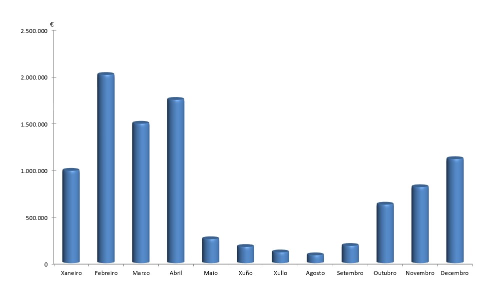 | Xaneiro | Febreiro | Marzo | Abril | Maio | Xuño | Xullo | Agosto | Setembro | Outubro | Novembro | Decembro | Total | |