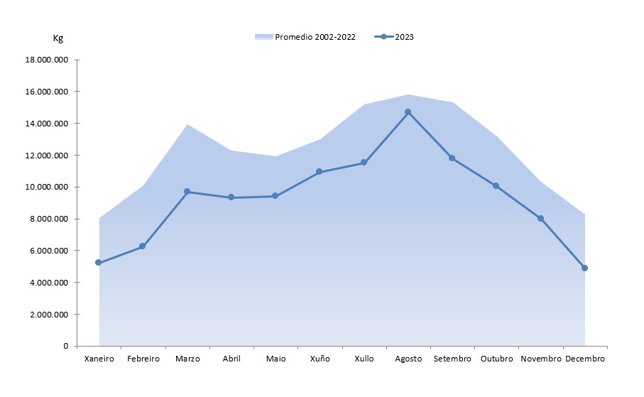 | Xaneiro | 5.235.865 | 21.004.810 | 5.767.079 | 21.102.197 | -531.214 | -97.387 | -9,21% | -0,46% |