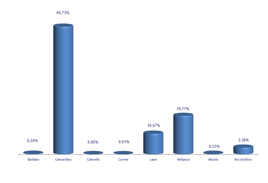 | Muxía | 9.192 | 0,23% | 87.325 | 0,82% | 9,50 |