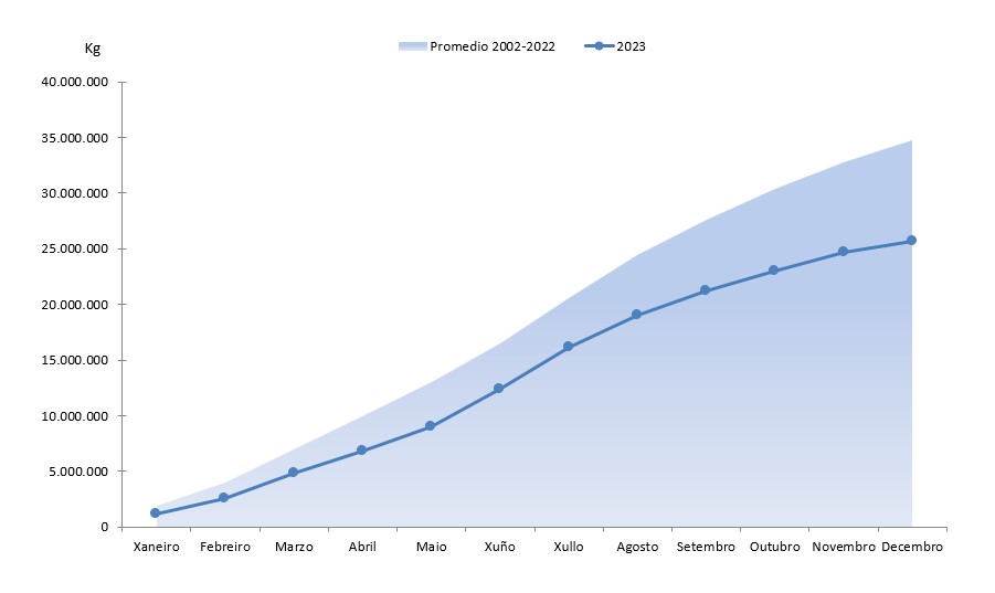 | A Coruña (Lonja Coruña, S.A.) | 24.447.516 | 62.283.169 | 27.678.102 | 64.860.359 | -3.230.586 | -2.577.190 | -11,67% | -3,97% |