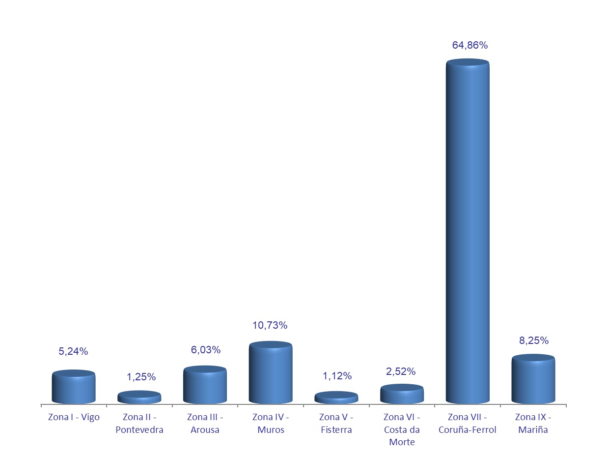 | Zona V - Fisterra | 3 | 16.309 | 1,12% | 10.886 | 0,38% | 0,67 |