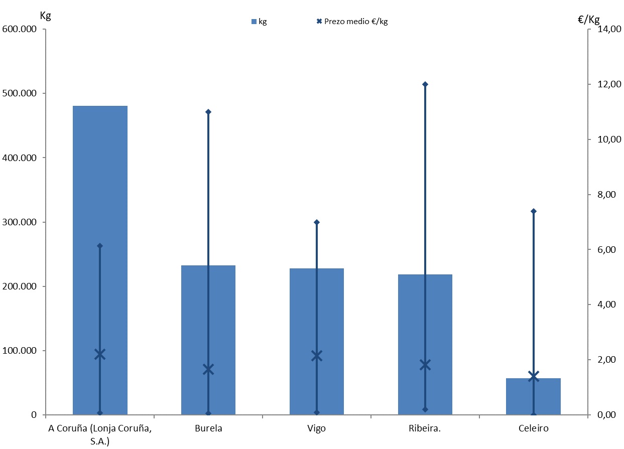 | A Coruña (Lonja Coruña, S.A.) | 249 | 481.117 | 38,29% | 1.057.941 | 42,64% | 2,20 |