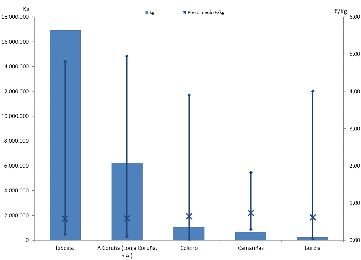| A Coruña (Lonja Coruña, S.A.) | 251 | 6.225.321 | 24,64% | 3.669.119 | 24,82% | 0,59 |