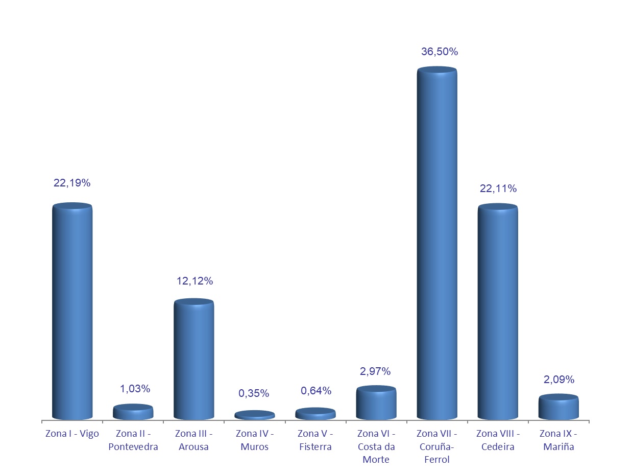 | Zona VI - Costa da Morte | 170 | 6.855 | 2,97% | 187.173 | 2,15% | 27,31 |