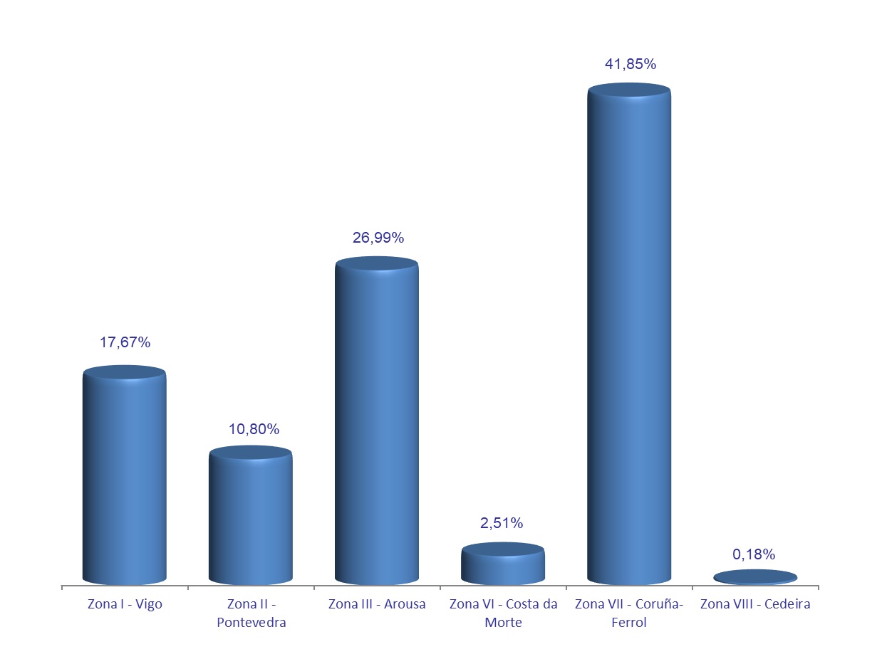 | Zona VI - Costa da Morte | 64 | 54.297 | 2,51% | 128.453 | 2,63% | 2,37 |