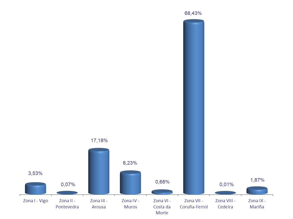 | Zona VIII - Cedeira | 9 | 99 | 0,01% | 288 | 0,01% | 2,92 |
