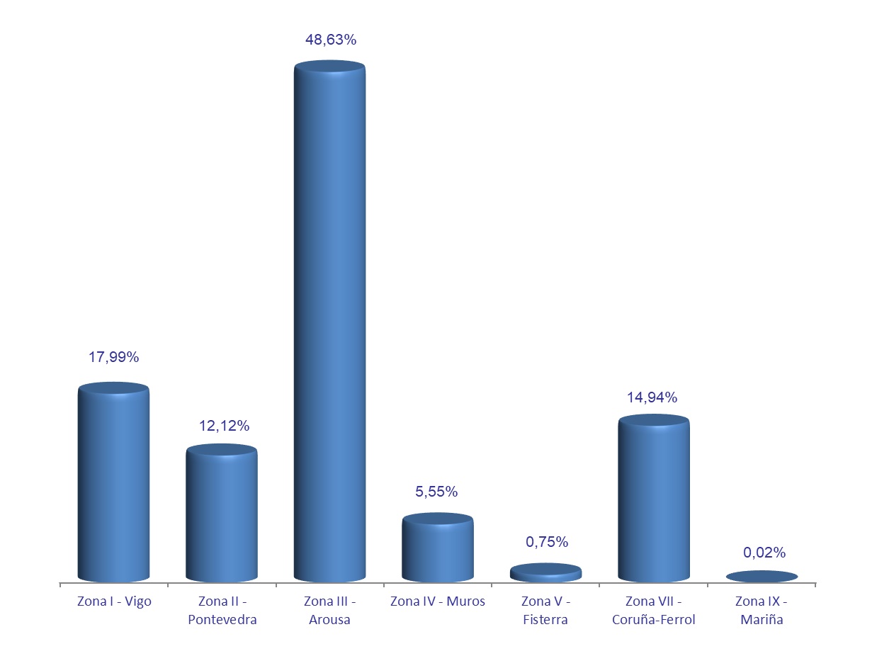 | Zona III - Arousa | 247 | 105.578 | 48,63% | 2.918.470 | 51,26% | 27,64 |