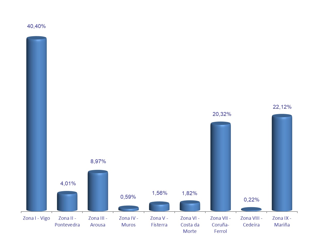 | Zona VI - Costa da Morte | 216 | 17.907 | 1,82% | 42.483 | 1,86% | 2,37 |
