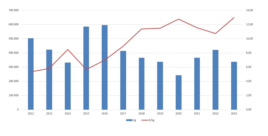 | Centola ou centolo | 151 | 15.189 | 4,50% | 205.835 | 4,70% | 13,55 |