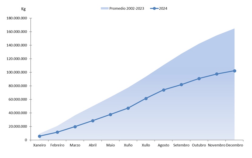 | Crustáceos | 1.093.815 | 21.423.428 | 1.128.513 | 21.074.054 | -34.698 | 349.374 | -3,07% | 1,66% |