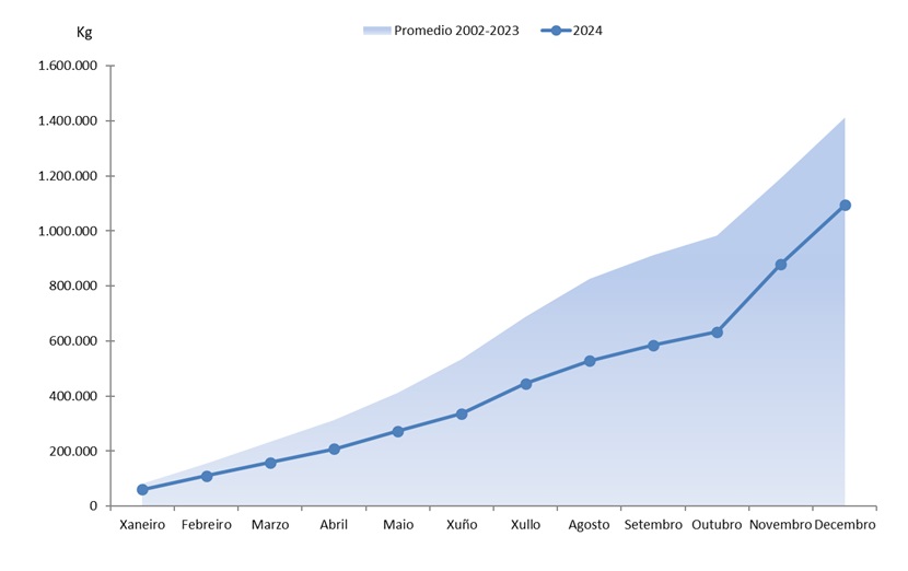 | Camarón común | 36.047 | 1.477.661 | 50.317 | 1.772.039 | -14.270 | -294.378 | -28,36% | -16,61% |