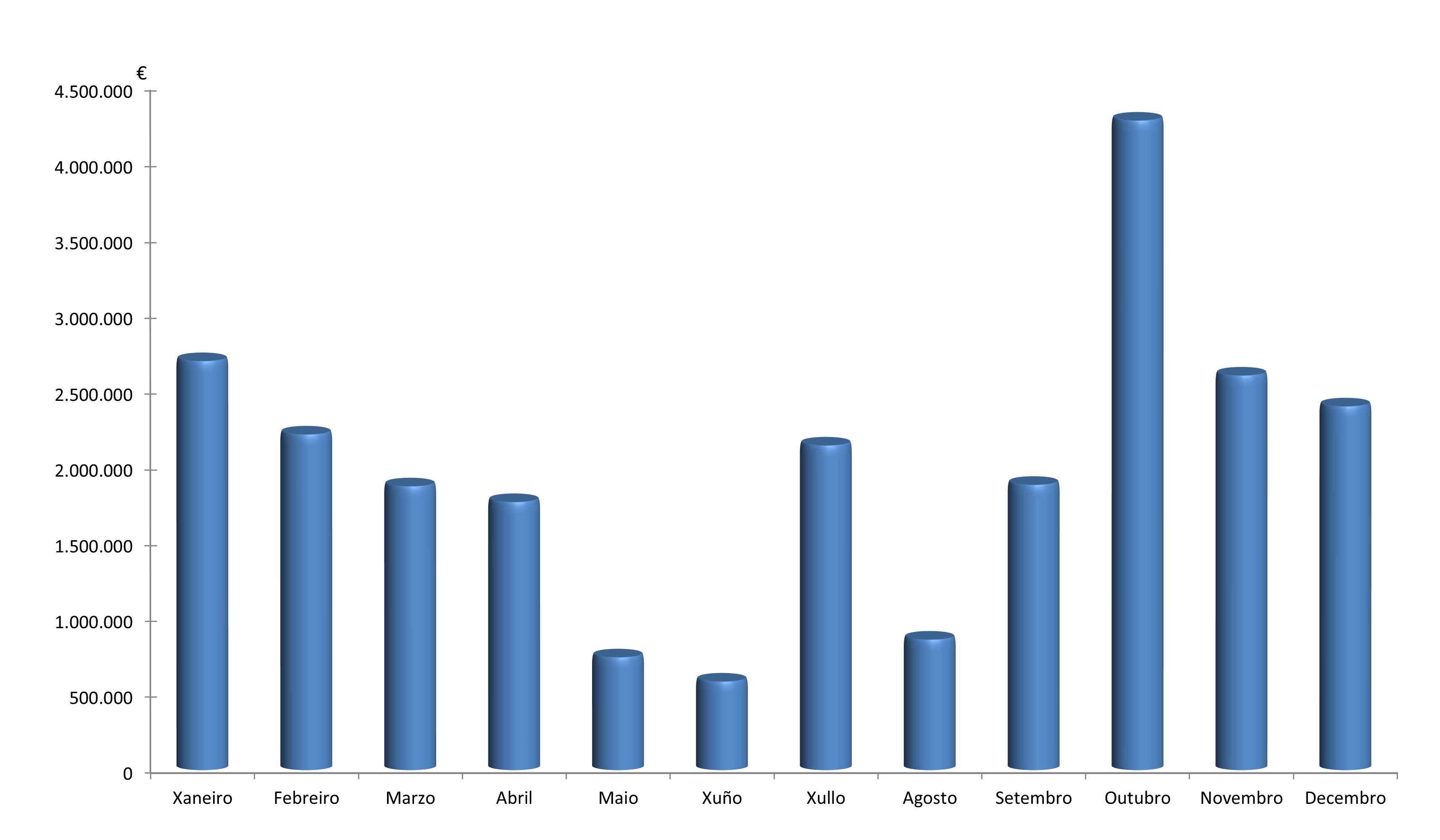 | Xaneiro | Febreiro | Marzo | Abril | Maio | Xuño | Xullo | Agosto | Setembro | Outubro | Novembro | Decembro | Total | |