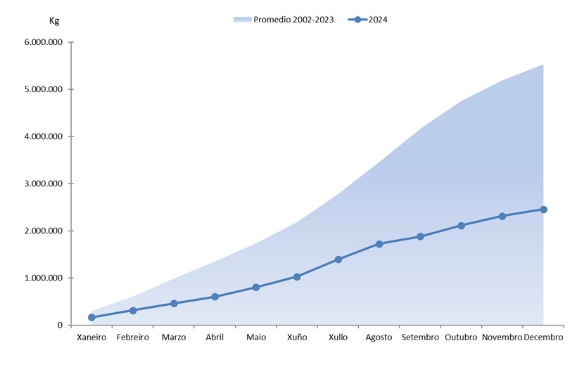 | Aldán-Hio | 89.530 | 940.939 | 82.917 | 764.420 | 6.613 | 176.519 | 7,98% | 23,09% |